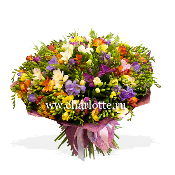 Букет из 101 разноцветной фрезии со множеством зелени в подарочной упаковке. По Вашему желанию цветовую гамму букета можно изменить, для этого звоните в наши салоны цветов или указывайте в разделе "комментарии для флориста" при заказе через интернет.