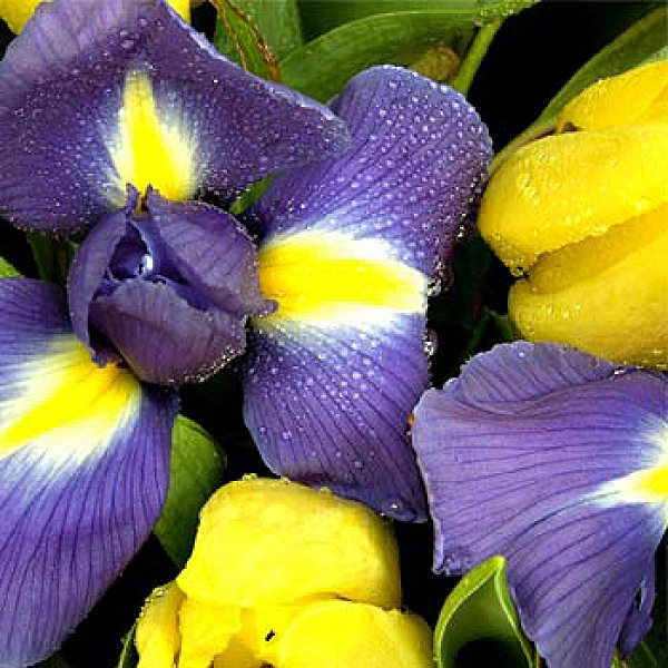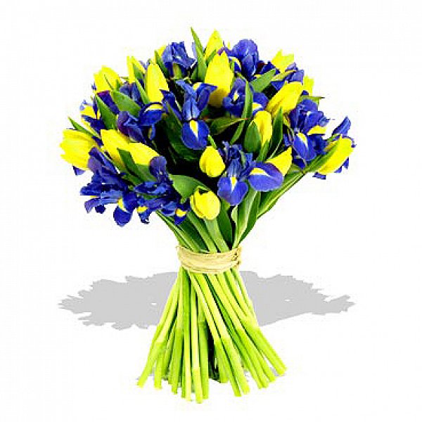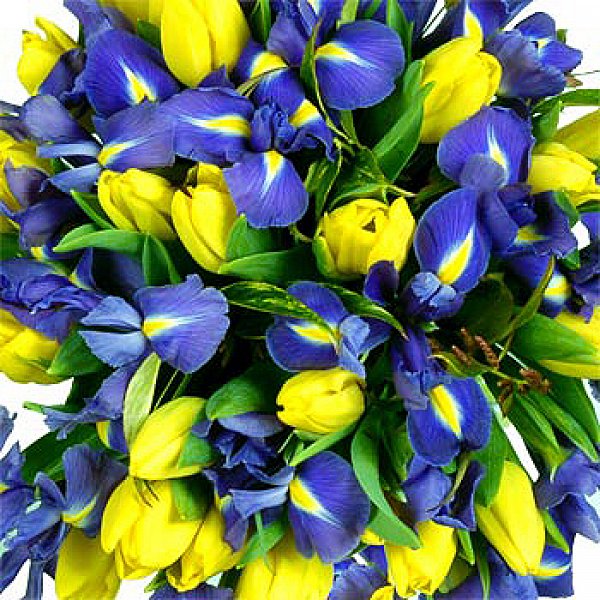 Очень красивый и контрастный букет из ирисов и тюльпанов. Если Вы хотите изменить цветовую гамму букета, звоните нашим операторам по телефону или указывайте в разделе "комментарии для флориста" при заказе через интернет.