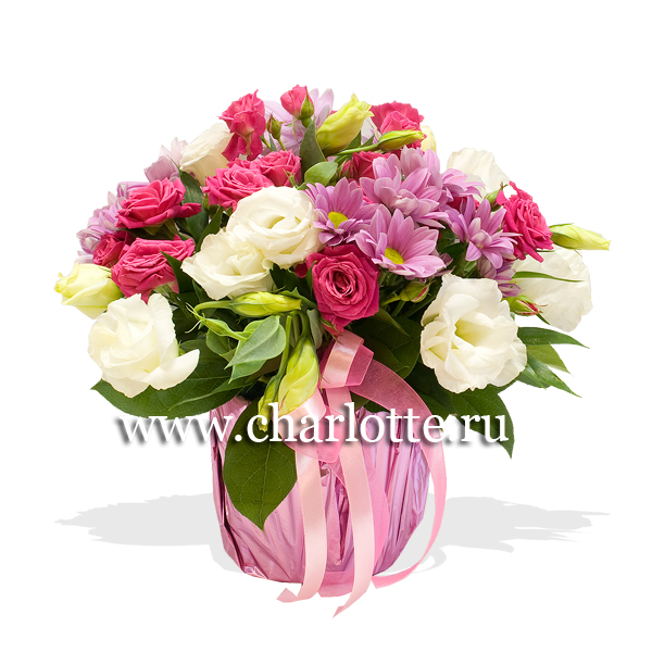 Композиция в бело-розовых тонах из кустовых роз, хризантем, лизиантусов с декоративной зеленью. По Вашему желанию цветовую гамму композиции можно изменить, для этого звоните в наши салоны цветов или указывайте в разделе "комментарии для флориста" при заказе через интернет.