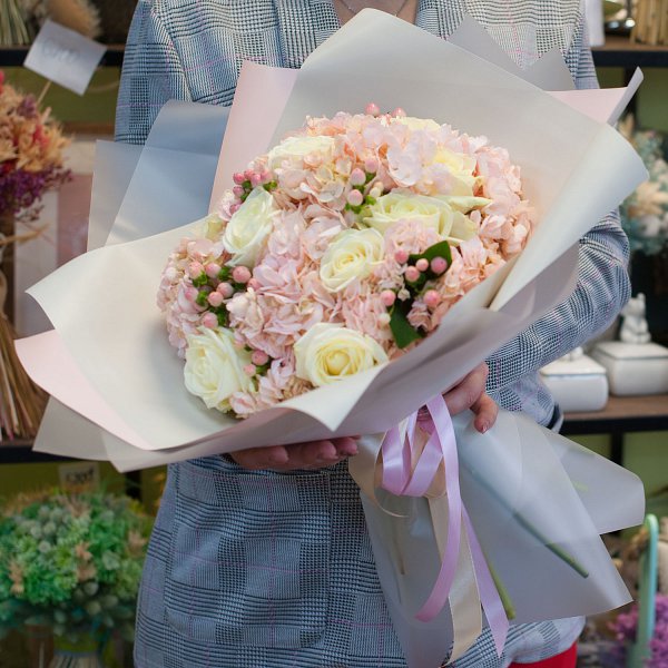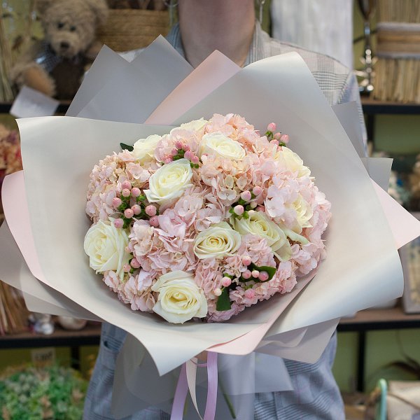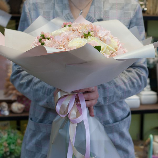 Букет в розовых тонах из гортензий, роз, гиперикума в подарочной упаковке.