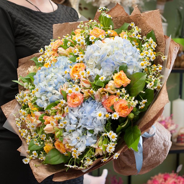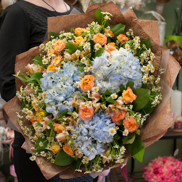 Букет из гортензии, ромашек, кустовых роз, альстромерий с декоративной зеленью в подарочной упаковке.