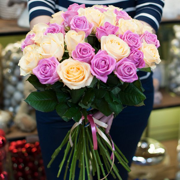 Букет из персиковых и розовых роз с лентой.