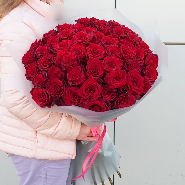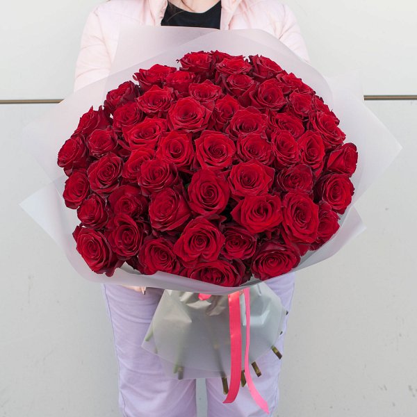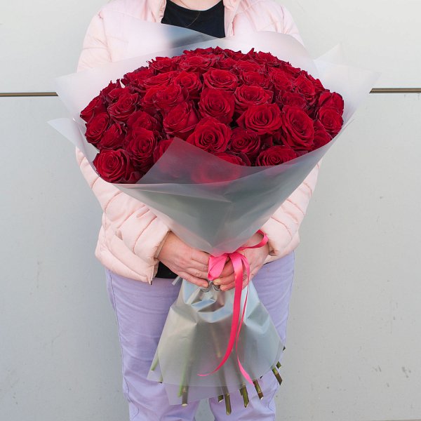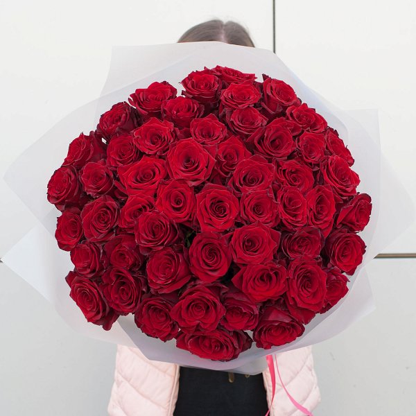 Букет состоит из 51 эквадорской красной розы высотой 70 см, что придает ему особую пышность и объем. Розы собраны на стеблях, что позволяет им сохранять свою форму и свежесть на протяжении долгого времени.
