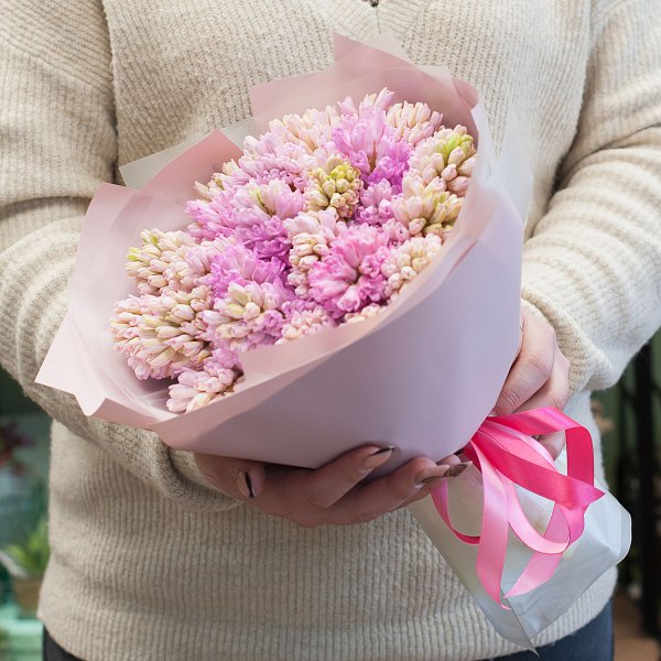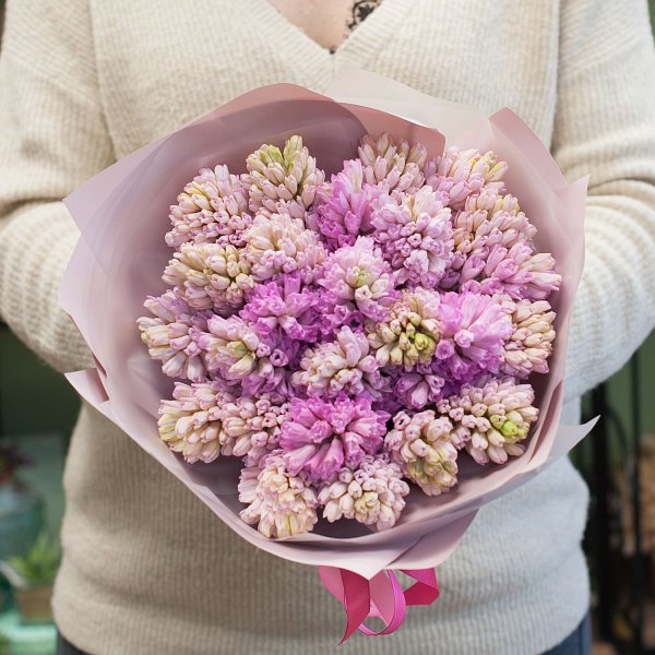 Букет состоит из 25 розовых гиацинтов, которые символизируют нежность и любовь. Эти цветы обладают тонким ароматом и будут радовать получателя своей красотой и свежестью.