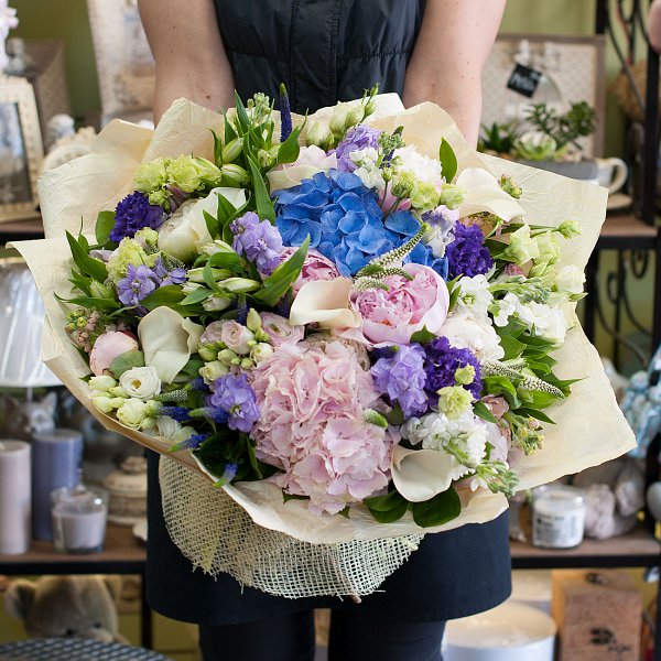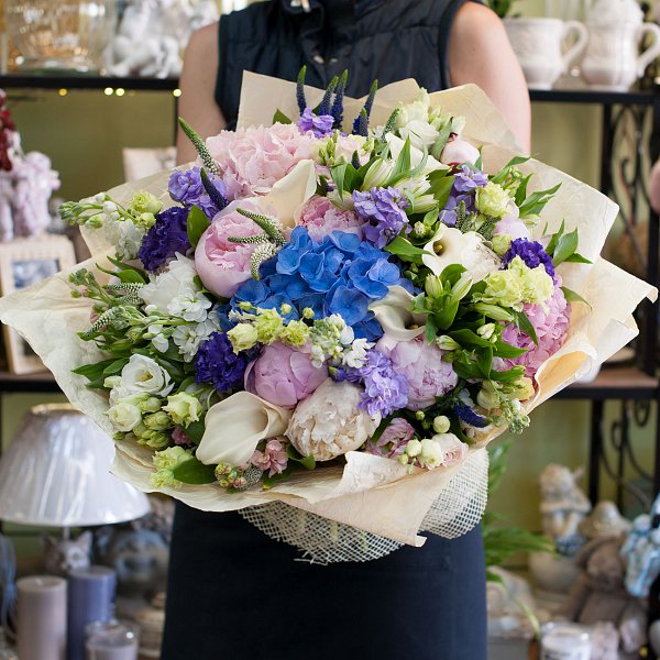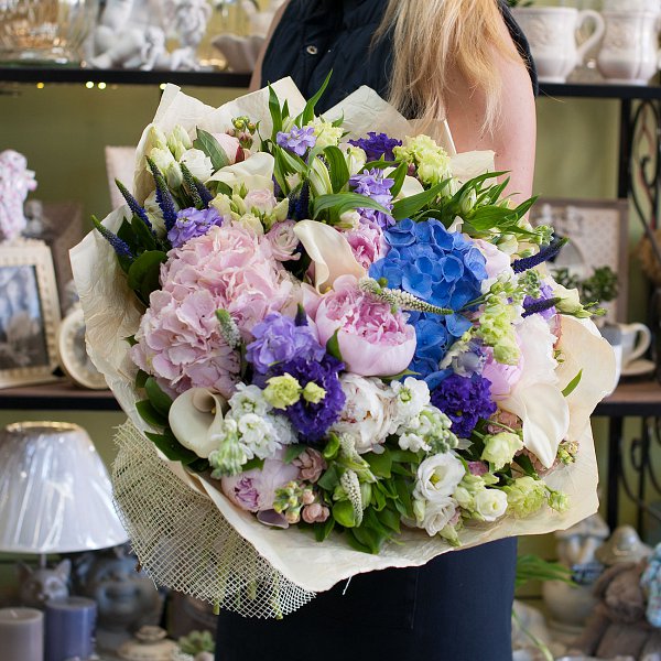 Букет состоит из разнообразных цветов, включая пионы, матиоллы, лизиантусы, альстромерии, веронику, каллы и гортензии. Такое сочетание цветов создает неповторимую композицию, которая будет радовать глаз и вызывать приятные эмоции.