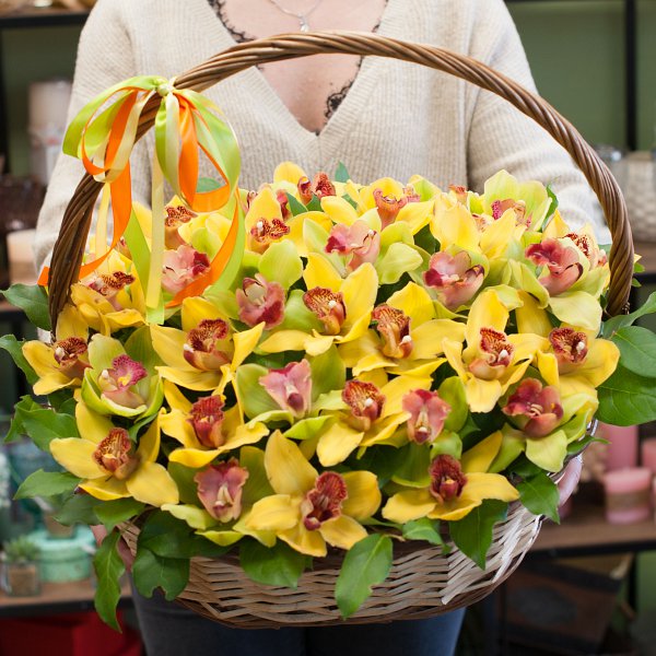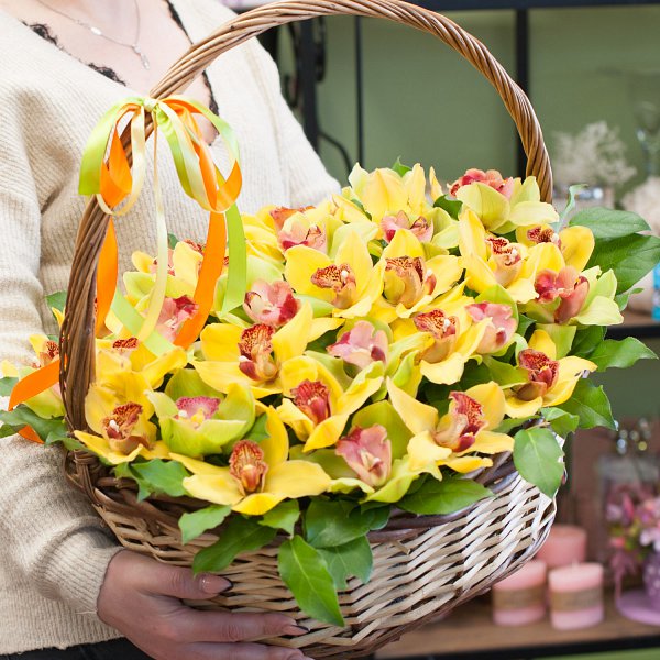 Корзина из желтых и зеленых орхидей с декоративной зеленью.