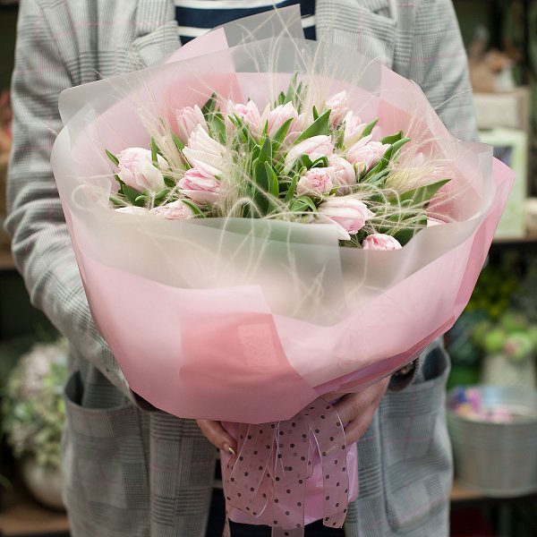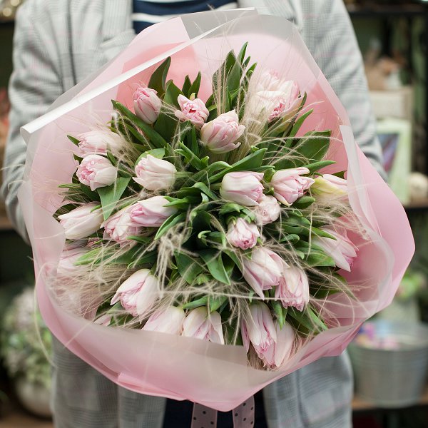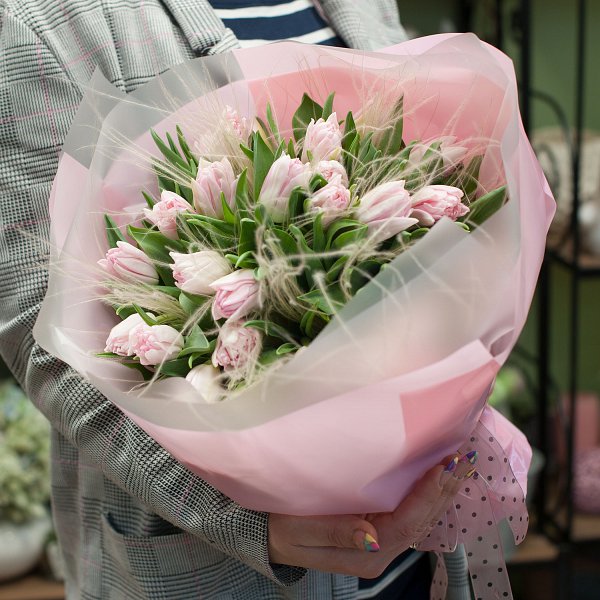 Букет из нежно-розовых пионовидных тюльпанов с ковылем в дизайнерской упаковке.