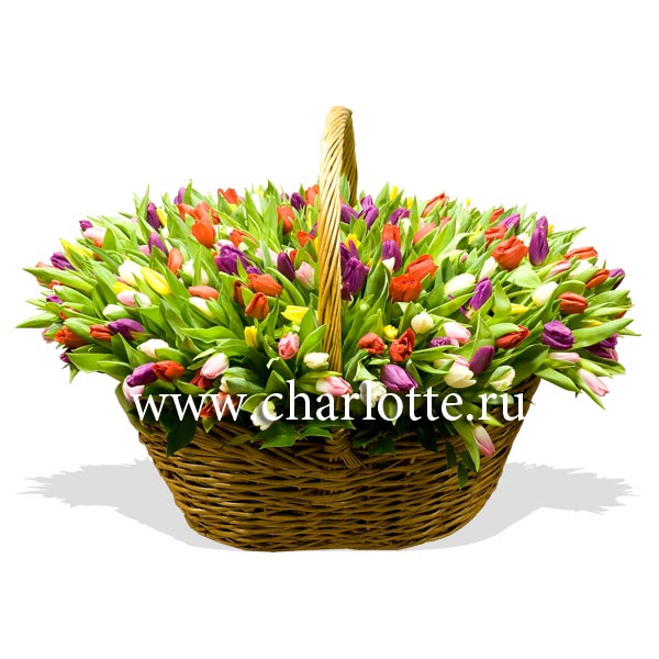 В стандартной корзине 251 тюльпан, размер такой композиции 1200*1000 см.