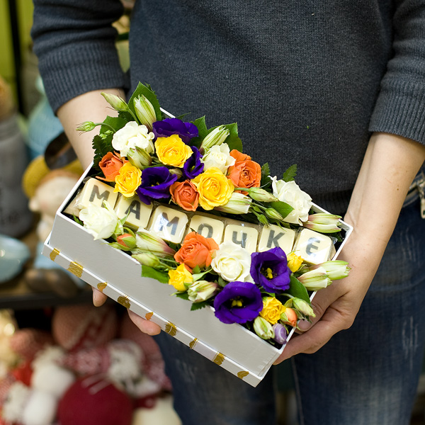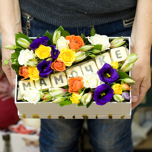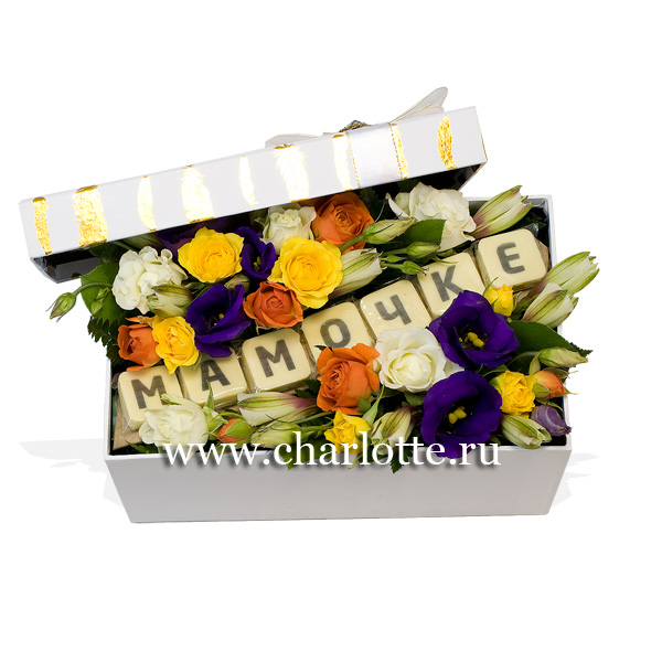 Коробка в ярких тонах с цветами и буквами с надписью "МАМОЧКЕ" из белого шоколада. По Вашему желанию мы можем сделать любую надпись, для этого звоните в наши салоны цветов или указывайте в разделе "комментарии для флориста" при заказе через интернет.