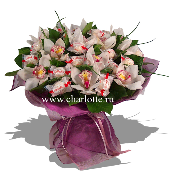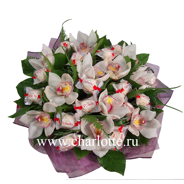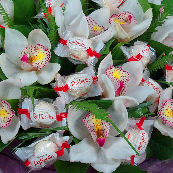 Букет в белых тонах из орхидей цимбидиум, зелени и конфет "Raffaello". Цветы оформляются в подарочную упаковку на усмотрение нашего флориста.