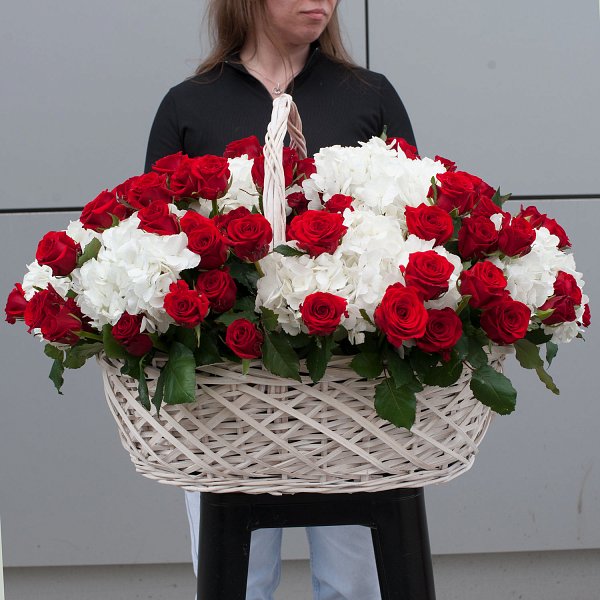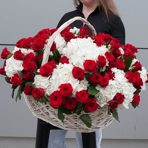 Корзина из ярких красных роз и белой гортензии "Viva la Vita" - это уникальное сочетание цветов, которое станет отличным подарком для любого случая.