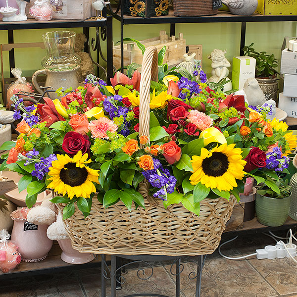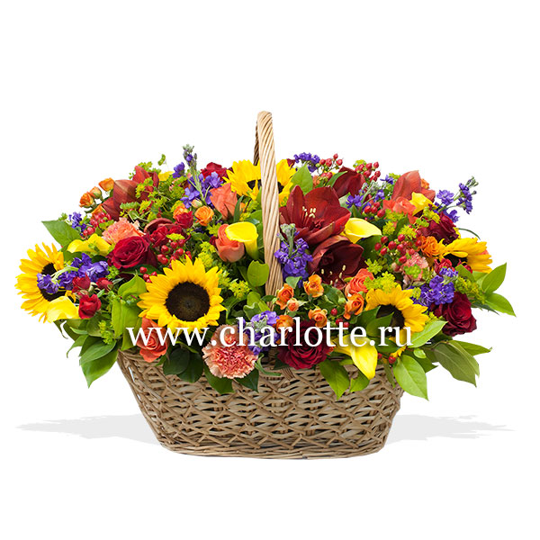 Корзина в ярких тонах из подсолнухов, красных амарилисов, кустовой оранжевой розы, кустовая красной розы, желтых калл, матиоллы, розы Вау, красной эквадорской розы, гвоздики оранжевой, буплерума, гиперикума с декоративной зеленью.