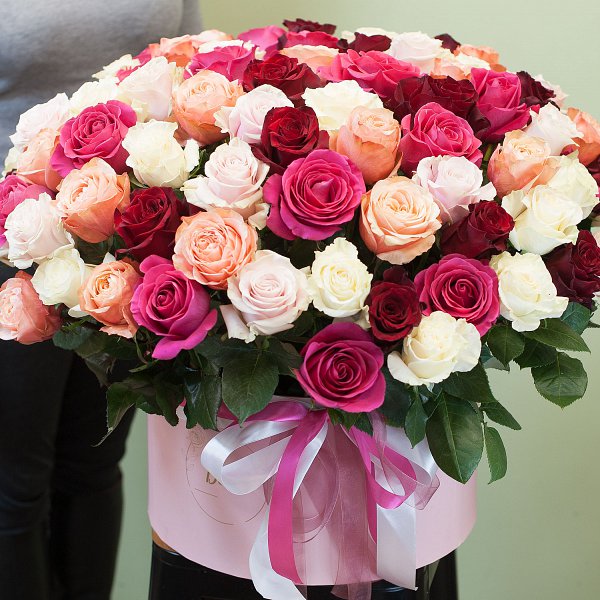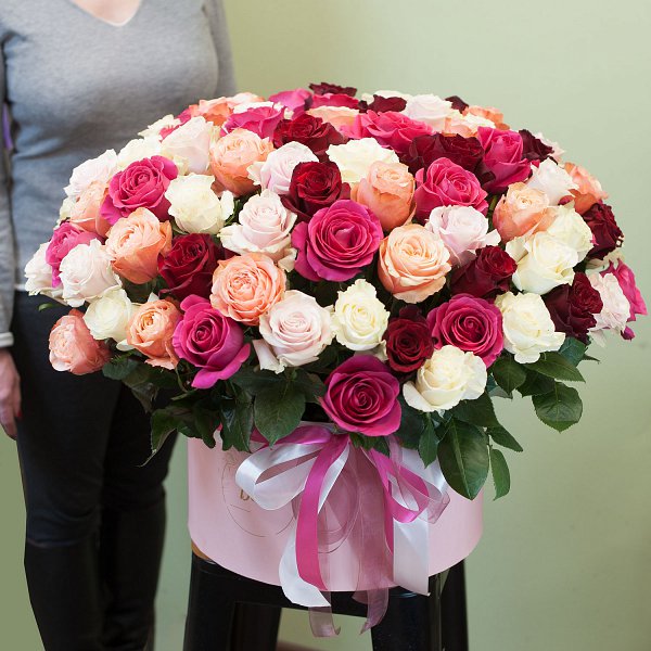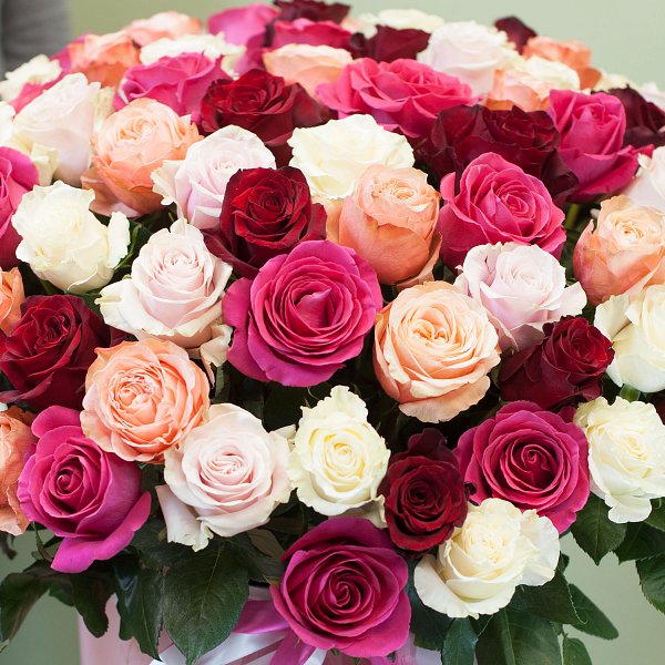 В составе композиции - 101 роза в нежных тонах, которые создают атмосферу легкости и романтики. Розы - символ любви и страсти, они прекрасно дополнят любой подарок и сделают его еще более запоминающимся.