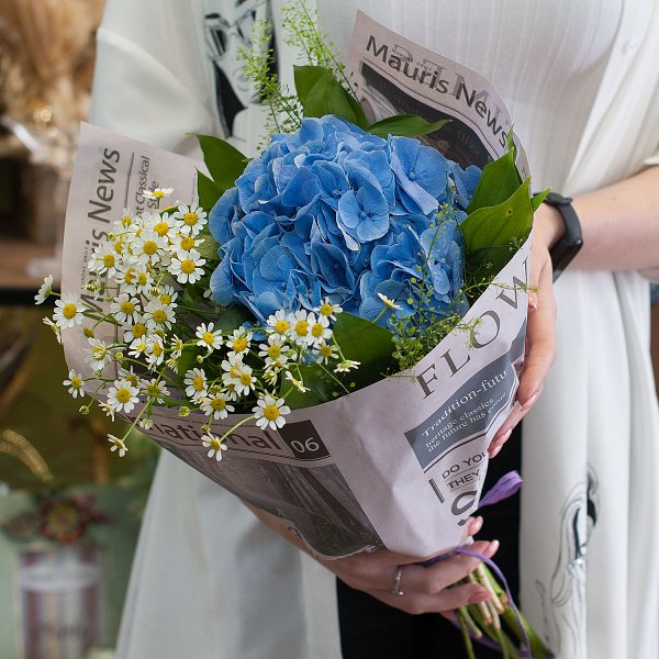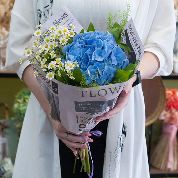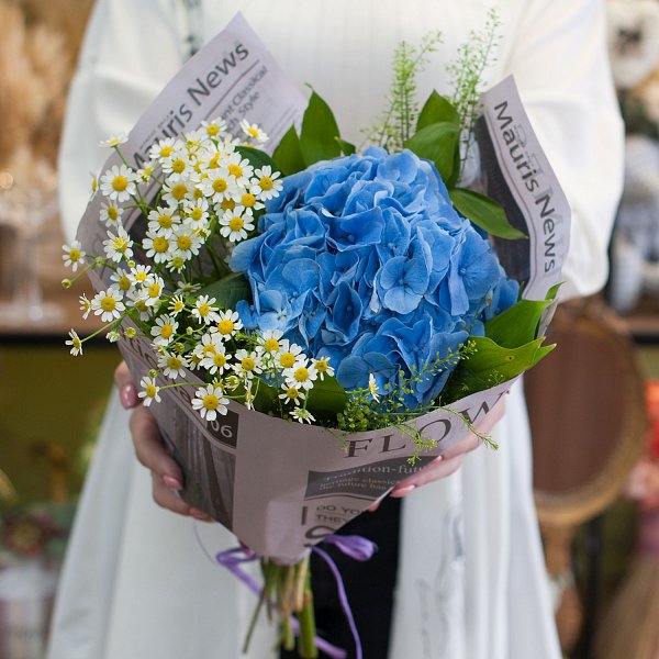 Букет из синей гортензии, ромашек, грин белла с декоративной зеленью в подарочной упаковке.