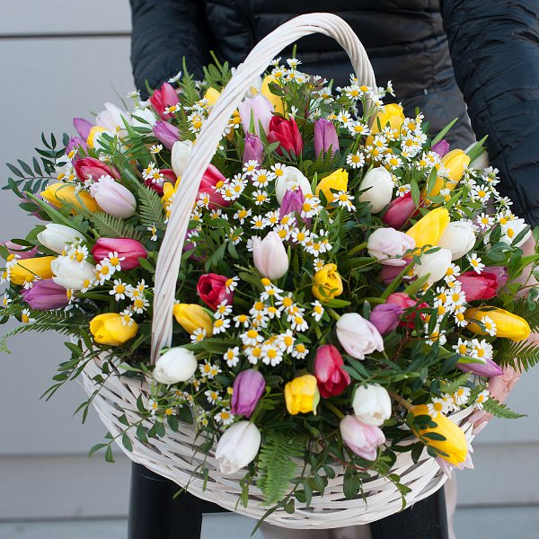 Выбирая корзину из весенних цветов "Тюльпаны с ромашками", вы делаете прекрасный и запоминающийся подарок, который будет радовать получателя своей красотой и свежестью.