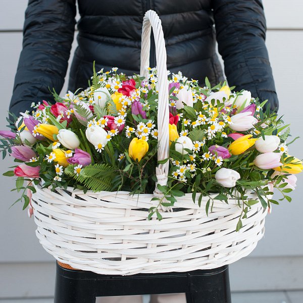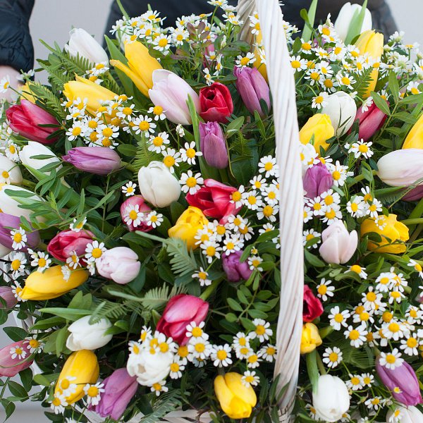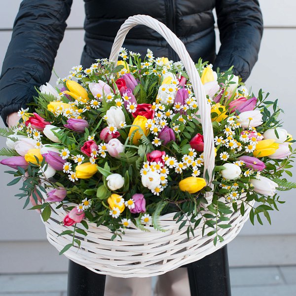 Корзина из весенних цветов "Тюльпаны с ромашками" - это уникальное сочетание красоты и свежести.