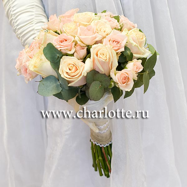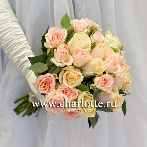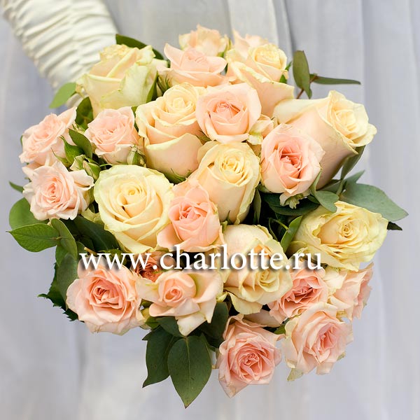 Букет невесты в кремовых тонах из одноголовых и кустовых роз с декоративной зеленью и лентой. По Вашему желанию цветовую гамму букета можно изменить, для этого звоните в наши салоны цветов или указывайте в разделе "комментарии для флориста" при заказе через интернет.