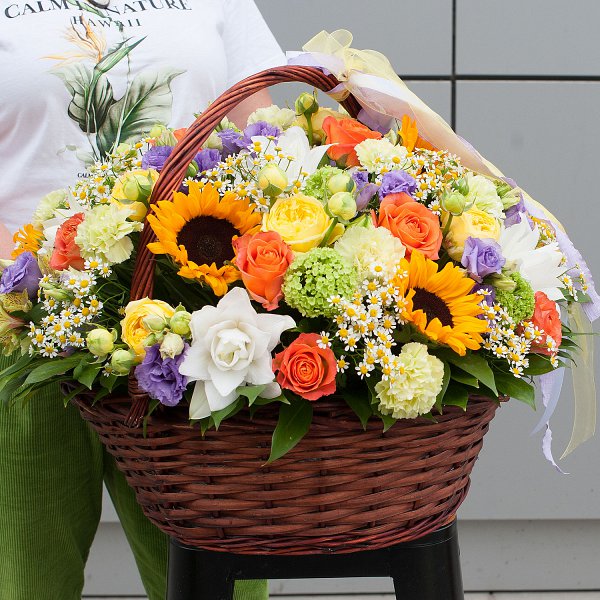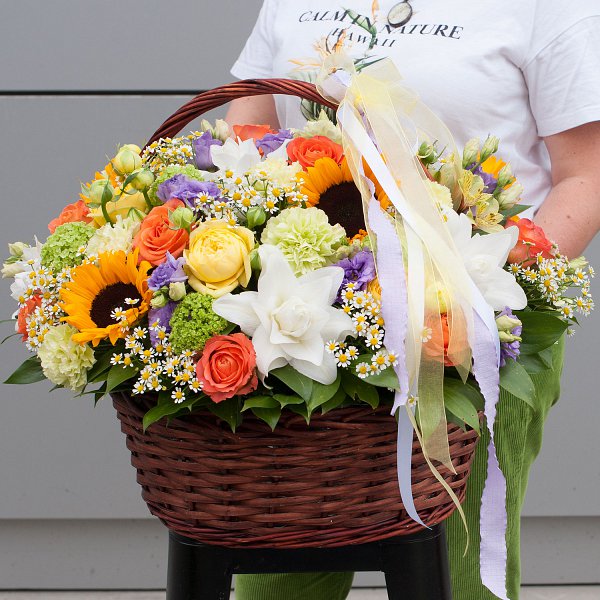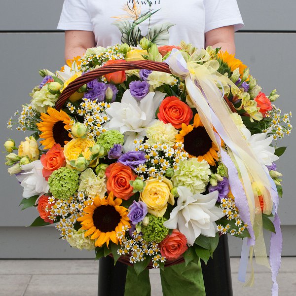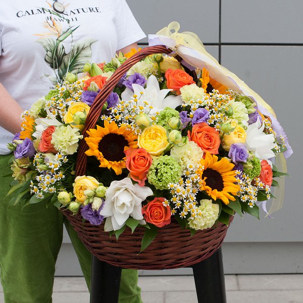 Корзина из летних цветов "Лето- это любовь" - это уникальное сочетание ярких и ароматных цветов, которые подарят радость и теплоту вашим близким.