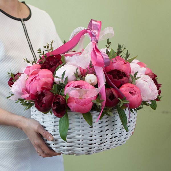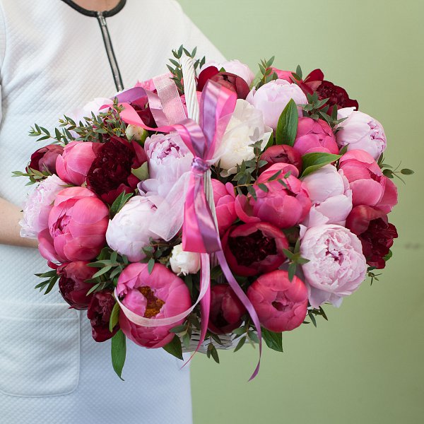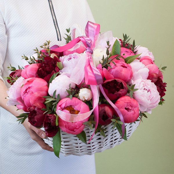 Корзинка из разноцветных пионов с зеленью.