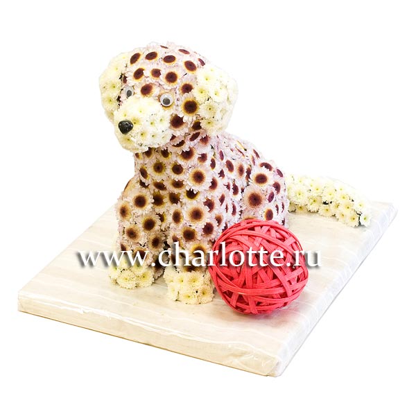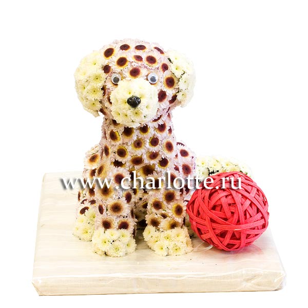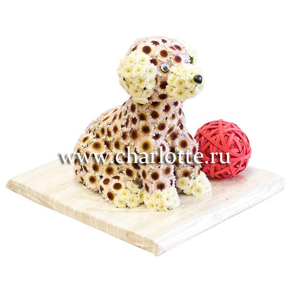 Фигура щенка из хризантемы сантини. По Вашему желанию цветовую гамму композиции можно изменить, для этого звоните в наши салоны цветов или указывайте в разделе "Комментарии для флориста" при заказе через интернет.