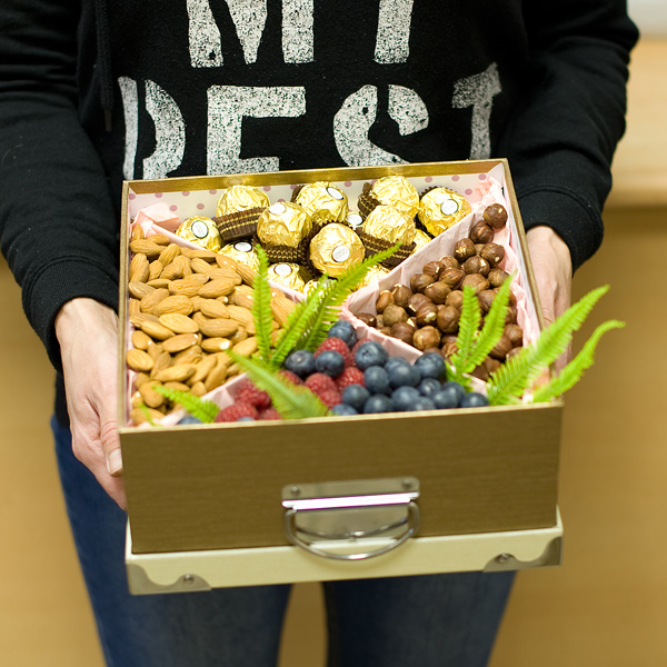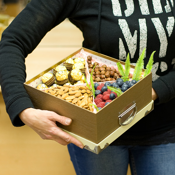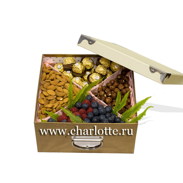 Подарочная коробка с миндалем, фундуком, малиной, голубикой, конфетами "Ферерро роше". По Вашему желанию состав композиции можно изменить, для этого звоните в наши салоны цветов или указывайте в разделе "комментарии для флориста" при заказе через интернет.