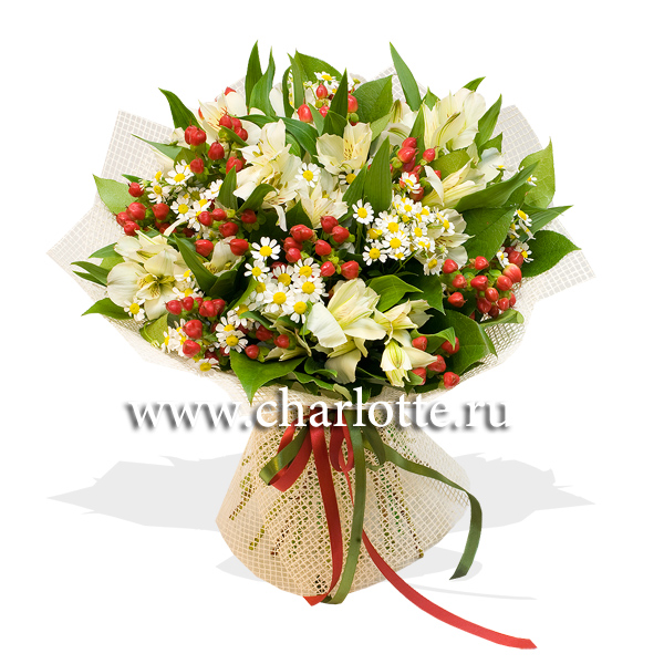 Букет в пастельных тонах из альстромерий, ромашек, гиперикума с декоративной зеленью. Цветы оформляются в подарочную упаковку на усмотрение нашего флориста. По Вашему желанию цветовую гамму букета можно изменить, для этого звоните в наши салоны цветов или указывайте в разделе "комментарии для флориста" при заказе через интернет.