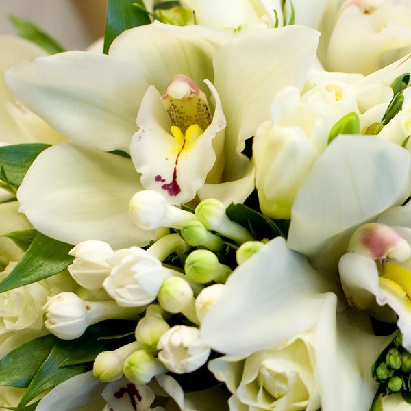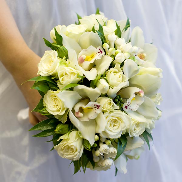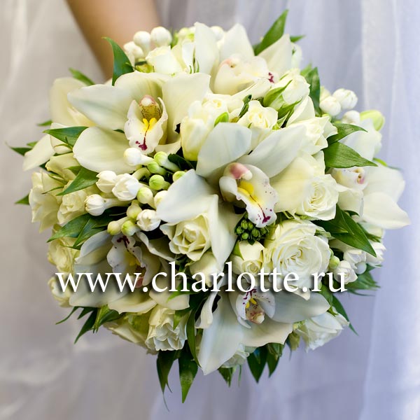 Букет невесты круглой формы на портбукетнице из орхидей цимбидиум, кустовой розы, бовардии с декоративной зеленью. Цвет орхидей может немного отличаться от оригинала.