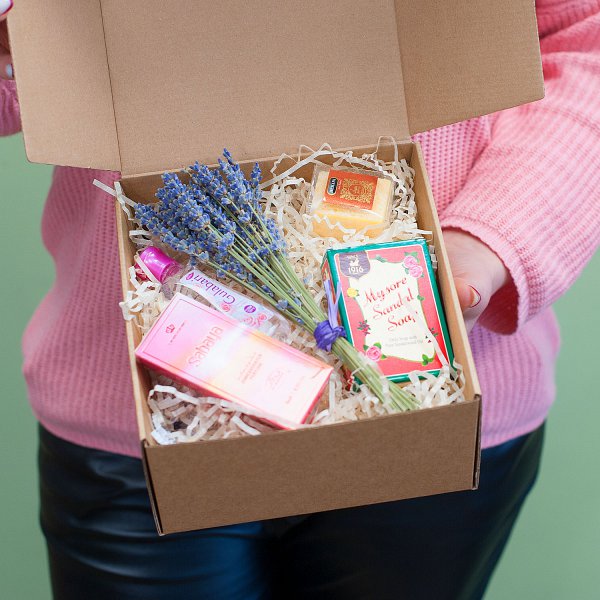 Подарочный набор в крафтовой коробке, который собран из маслянных духов, сухих духов, мыла, розовой воды с сухоцветами.