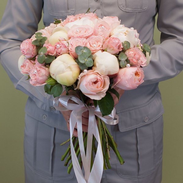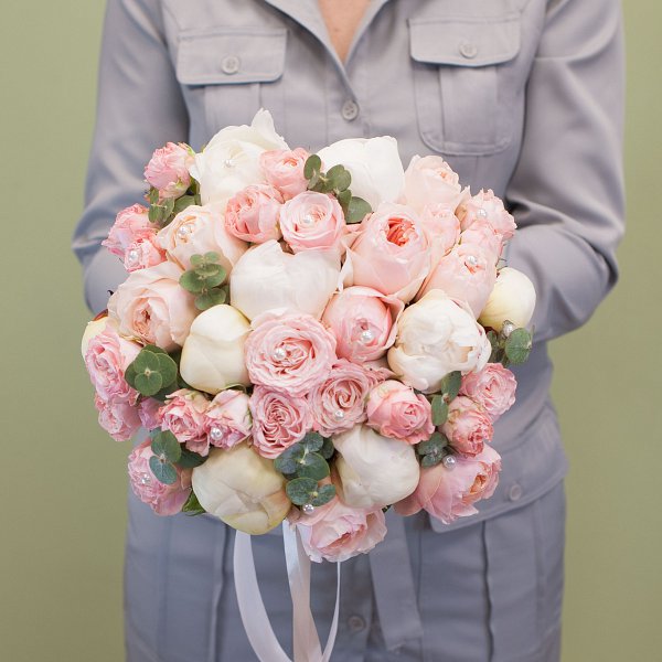 Букет невесты в нежной гамме из пионовидных кустовых роз, одноголовых пионовидных роз, пионов с эвкалиптом и жечугом.
