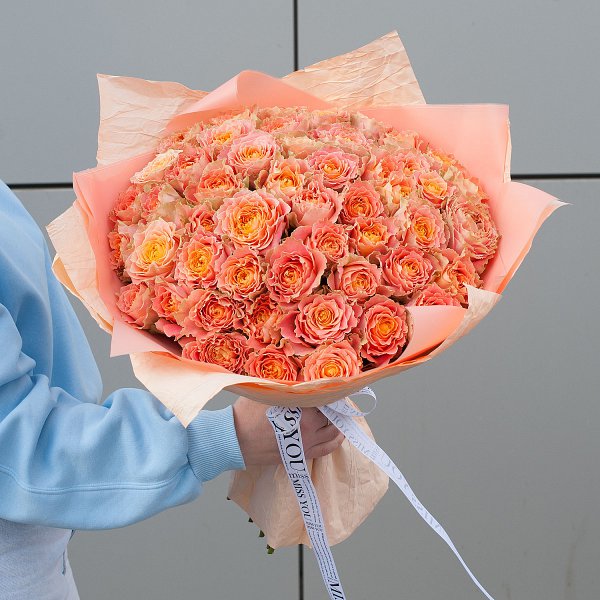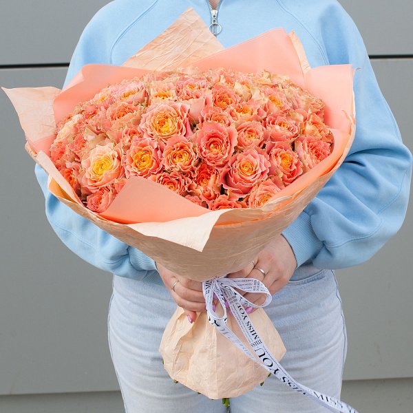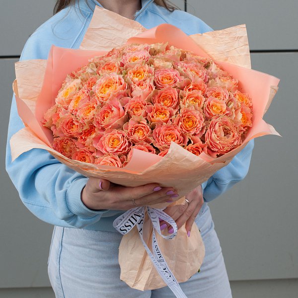 Букет состоит из 49 оранжевых пионовидных роз, которые собраны на стеблях и упакованы в крафт-бумагу. Такой монобукет будет выглядеть элегантно и изысканно, а также подчеркнет ваш вкус и внимание к деталям.