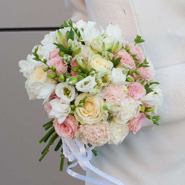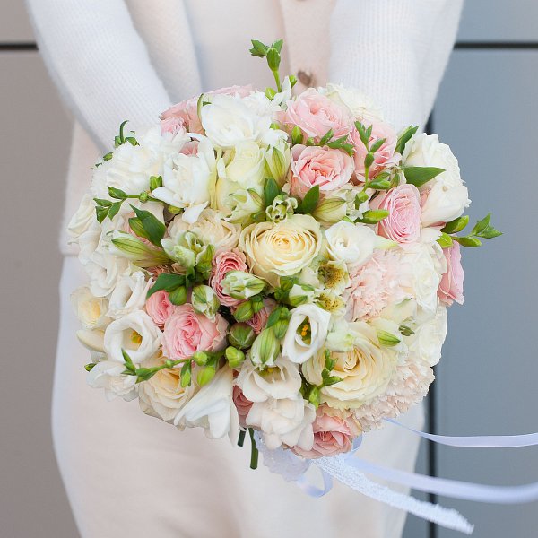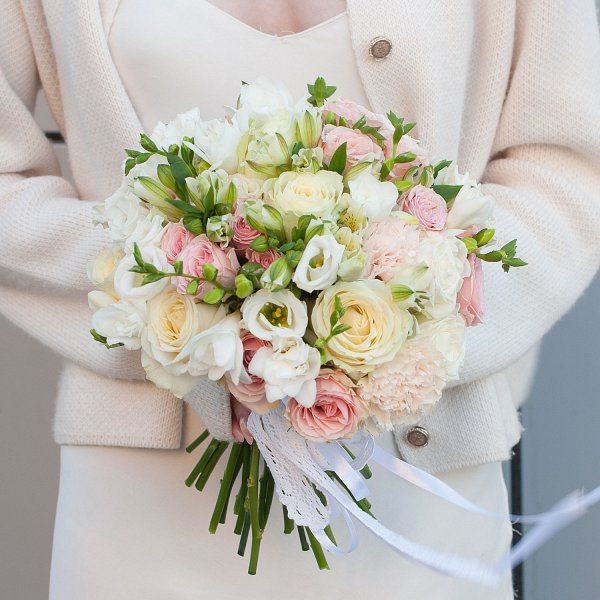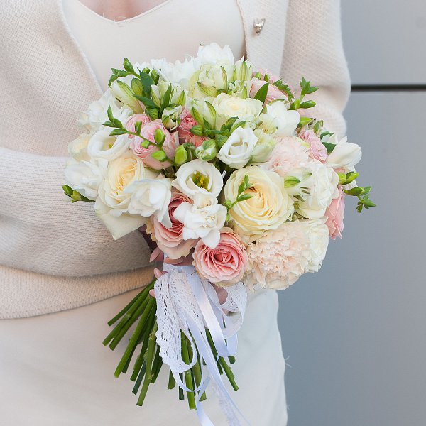 Букет выполнен в нежных кремовых тонах, которые создают атмосферу легкости и романтики. Белый и бежевый цвета гармонично сочетаются, создавая изысканный и утонченный образ.