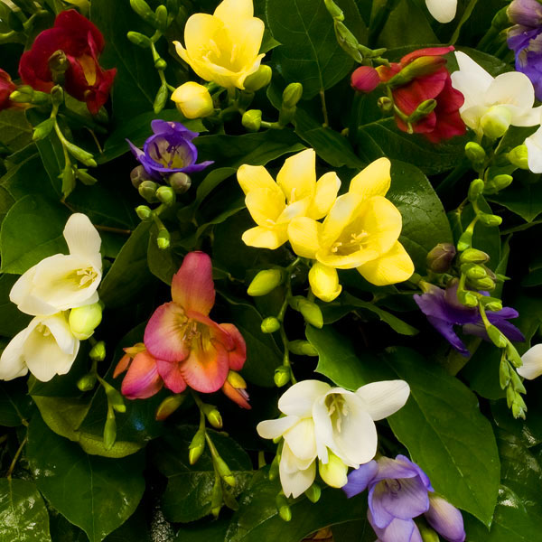 Корзинка из разноцветных фрезий с декоративной зеленью. По Вашему желанию цветовую гамму композиции можно изменить, для этого звоните в наши салоны цветов или указывайте в разделе "комментарии для флориста" при заказе через интернет.