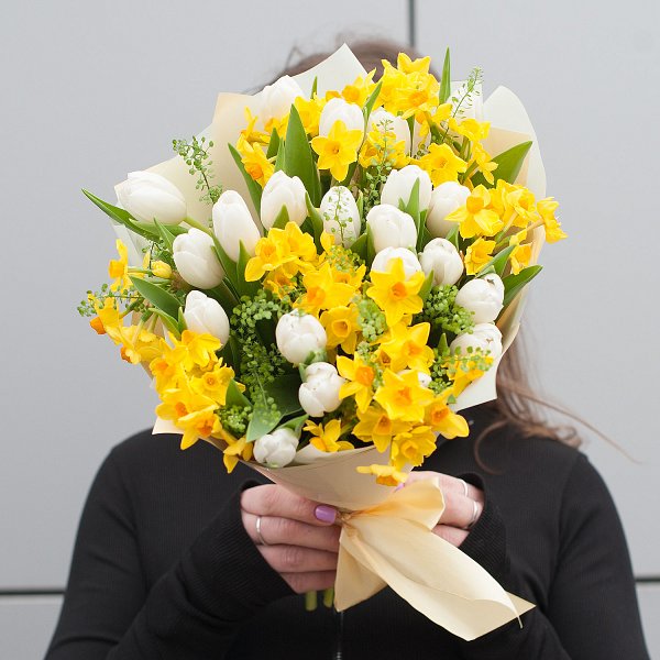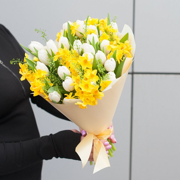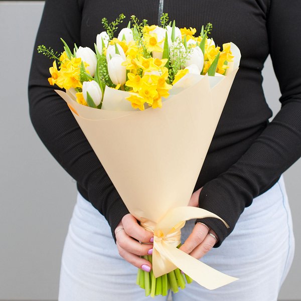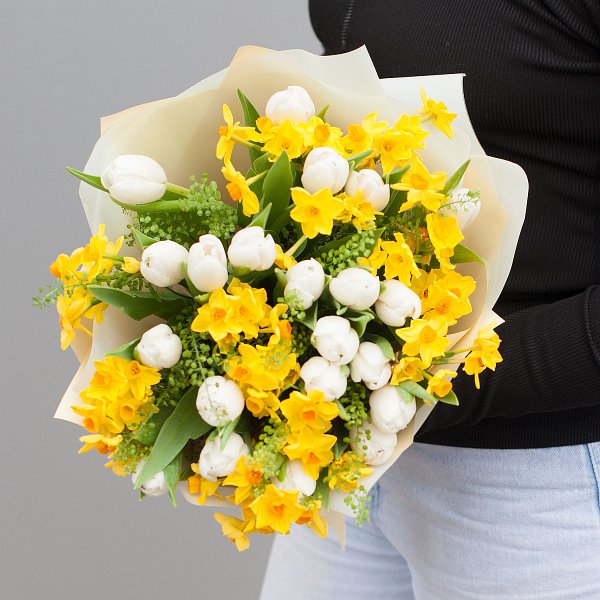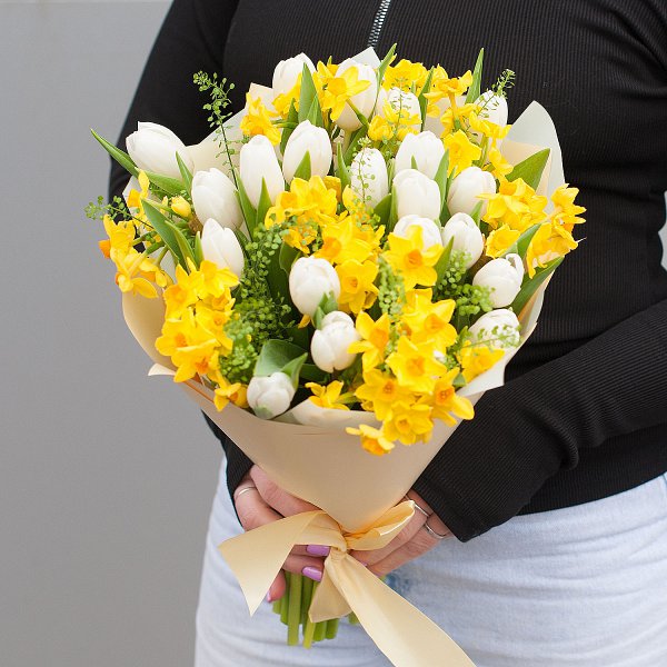 Букет из белых тюльпанов и желтых нарциссов "Весенняя радость" - это стильный и яркий подарок, который подойдет для любого повода.