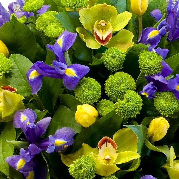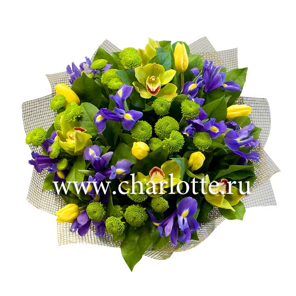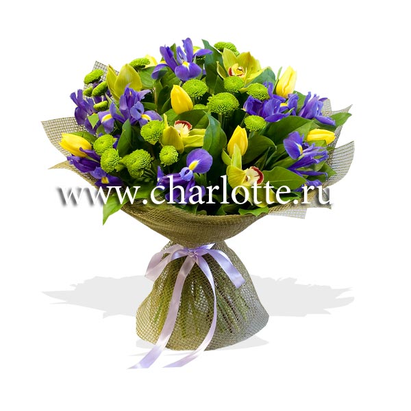 Букет из тюльпанов, ирисов и хризантем с зеленью. Цветы оформляются в подарочную упаковку на усмотрение нашего флориста. По Вашему желанию цветовую гамму букета можно изменить, для этого звоните в наши салоны цветов или указывайте в разделе "комментарии для флориста" при заказе через интернет.