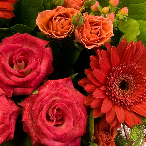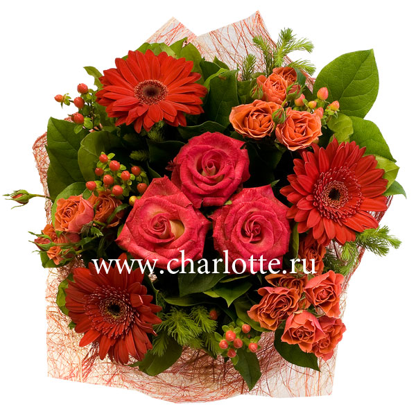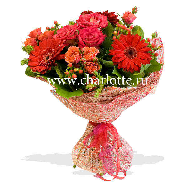 Букет в красных тонах из роз, гербер, гиперикума, декоративной зелени. Цветы оформляются в подарочную упаковку на усмотрение нашего флориста. По Вашему желанию цветовую гамму букета можно изменить, для этого звоните в наши салоны цветов или указывайте в разделе "комментарии для флориста" при заказе через интернет.