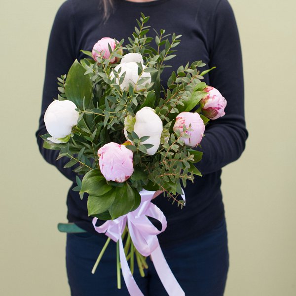 Букет состоит из семи розовых и белых пионов, которые гармонично сочетаются с зеленью и лентами. Такой состав цветов создает неповторимую атмосферу и подчеркивает индивидуальность подарка.