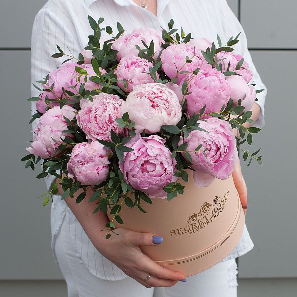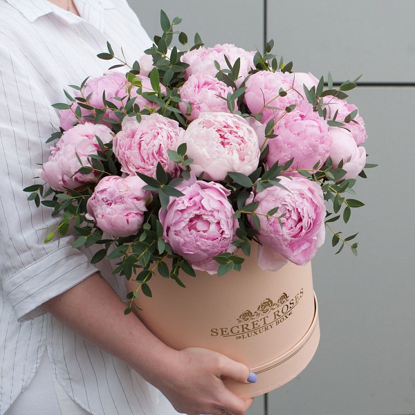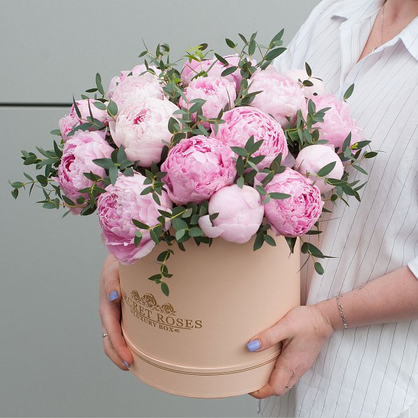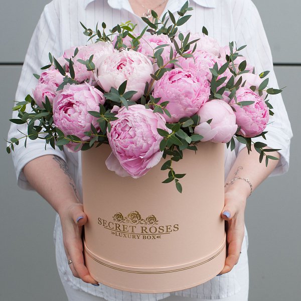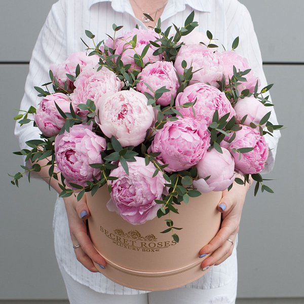 Коробка из розовых пионов с эвкалиптом "Милое создание" - это изысканный и стильный подарок, который подойдет для любого повода.