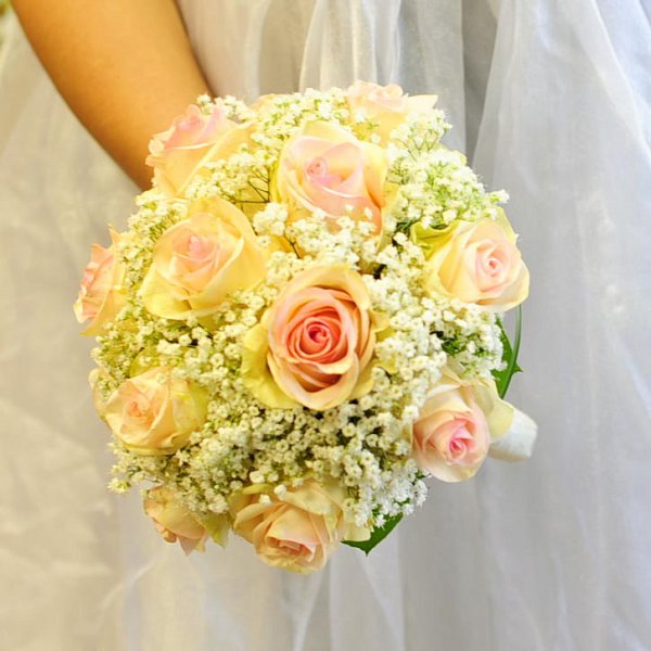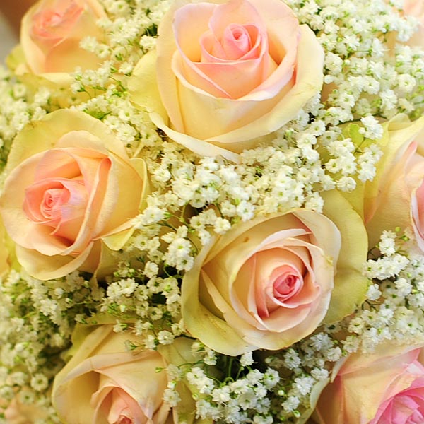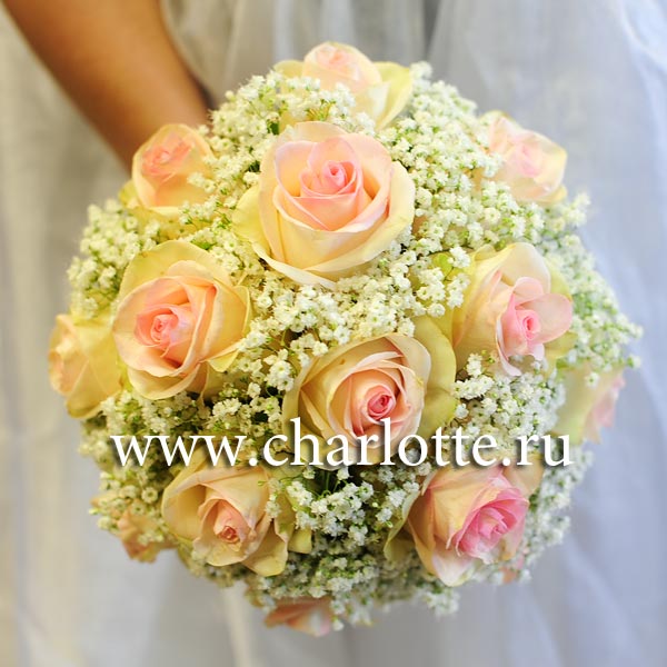 Букет невесты в бело-розовой гамме из роз Федора, гипсофилы. Букет собран на портбукетнице.