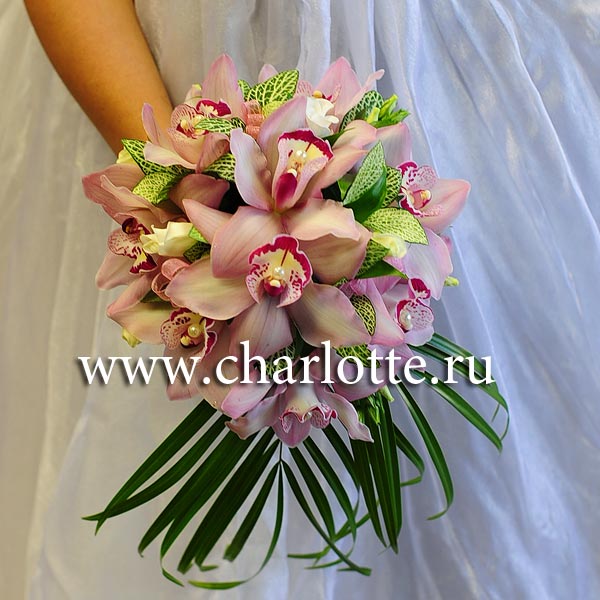 Букет невесты из орхидей цимбидиум, белых лизиантусов с декоративной зеленью и бижутерией на портбукетнице. По Вашему желанию цветовую гамму букета можно изменить, для этого звоните в наши салоны цветов или указывайте в разделе "комментарии для флориста" при заказе через интернет.