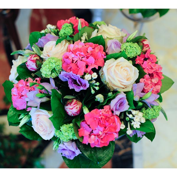 Композиция в ярких тонах из гортензий, нежно-розовых роз, белой бовардии, сиреневой фрезии, лизиантусов, вибурнума. Если Вы хотите изменить тона композиции, звоните в наш салон цветов.