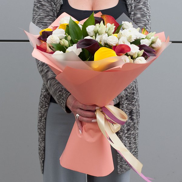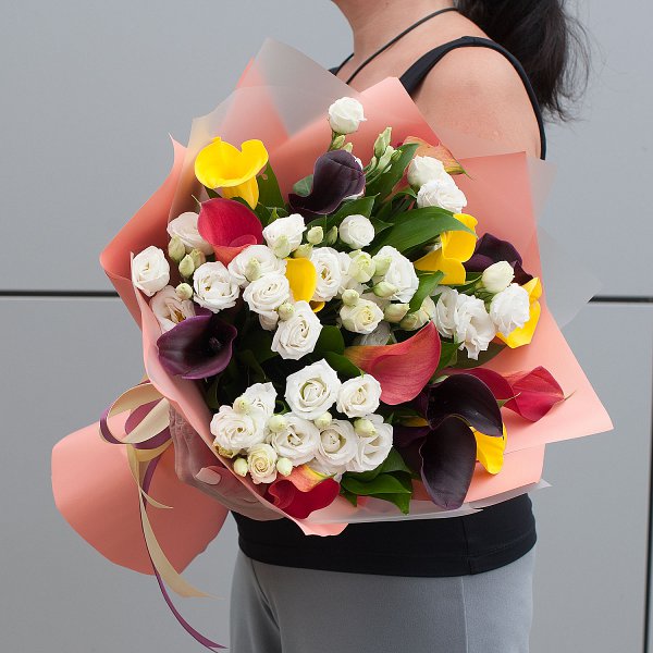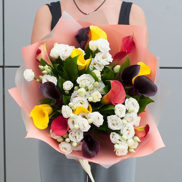 Букет цветов "Загадка" - это сборный букет, состоящий из разноцветных калл и белых лизиантусов. Он станет отличным подарком для любого повода, будь то день рождения, День семьи или День учителя.