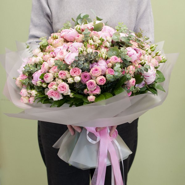 Букет выполнен в розовой гамме, что придает ему нежность и романтичность. В составе букета - 49 пионов, кустовых роз и эвкалипта, которые гармонично сочетаются с зеленью. Такой букет станет ярким акцентом в любом интерьере и подчеркнет ваш изысканный вкус.