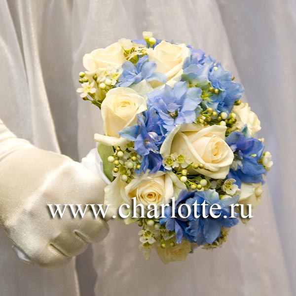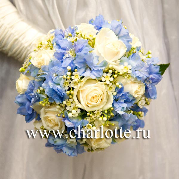 Букет невесты из кремовых роз, белого восковника, голубого дельфиниума с декоративной зеленью на портбукетнице. По Вашему желанию цветовую гамму букета можно изменить для этого звоните в наши салоны цветов или указывайте в разделе комментарии для флориста при заказе через интернет.