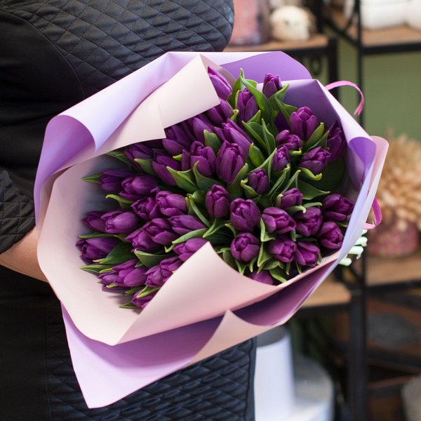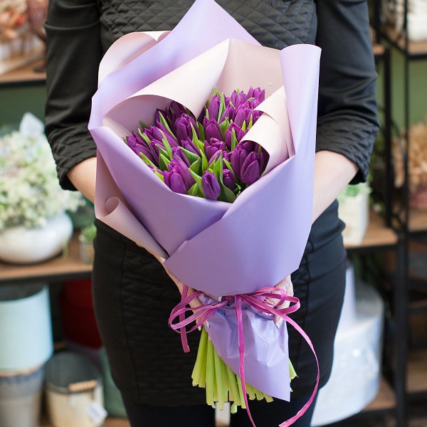 Букет из фиолетовых тюльпанов в дизайнерской упаковке.