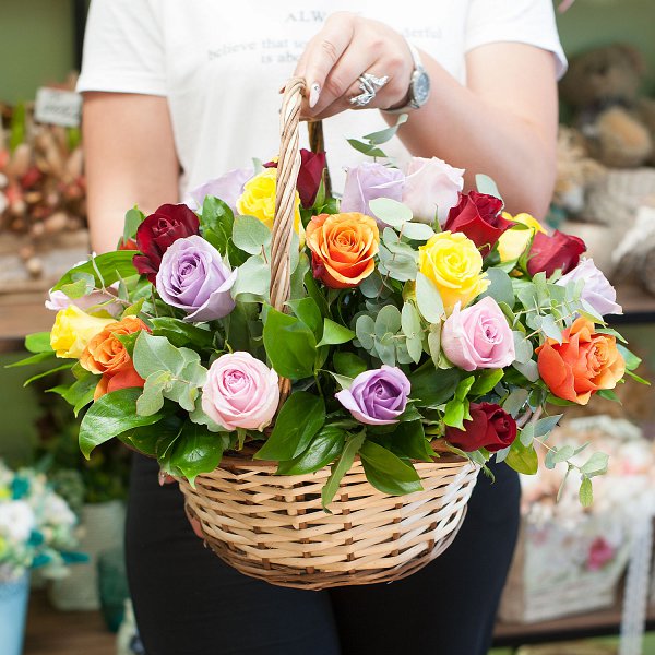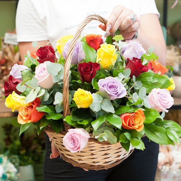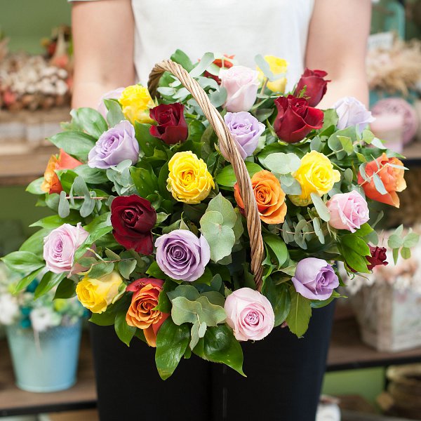 Корзина из разноцветных роз с зеленью и эвкалиптом.