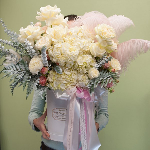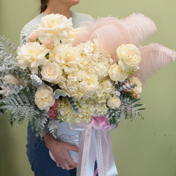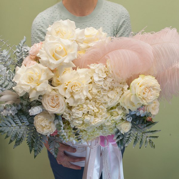 Авторская коробка с цветами в бело-розовой гамме из роз, пионовидных роз, пионовидных кустовых роз, гортензий со страусиными перьями и сухоцветами.