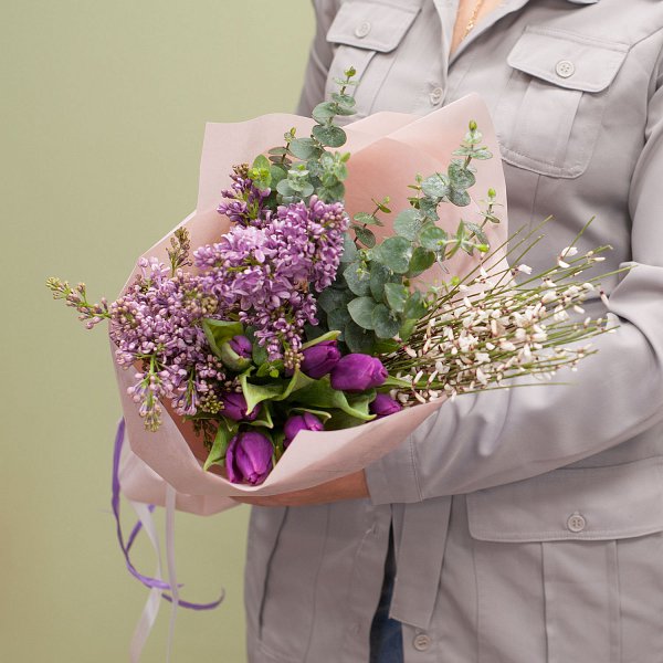 Букет в сиреневых тонах из тюльпанов, сирени, генисты с декоративной зеленью в подарочной упаковке.