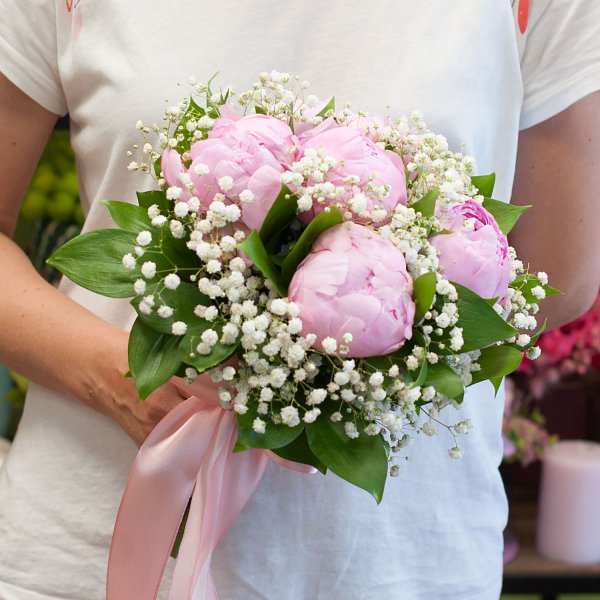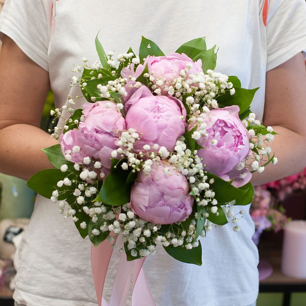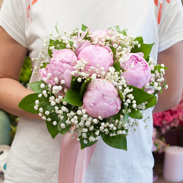 Букет невесты из розовых пионоы с белой гипсофилой, зеленью и лентами.