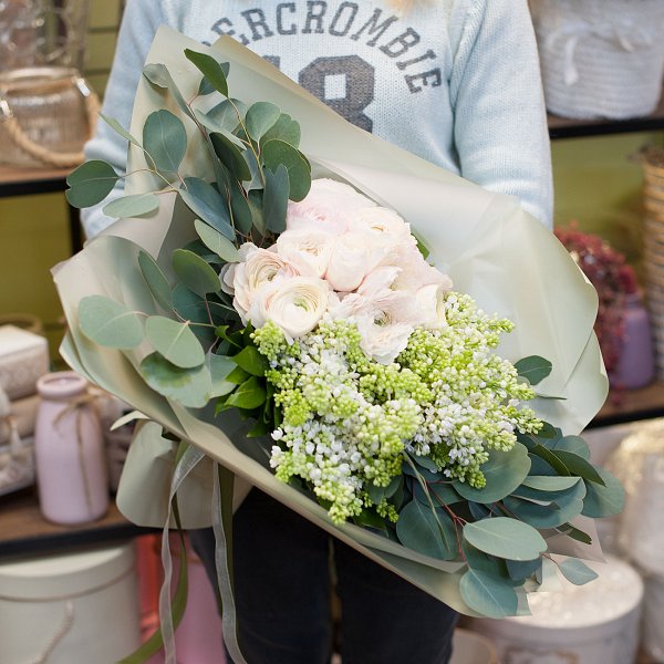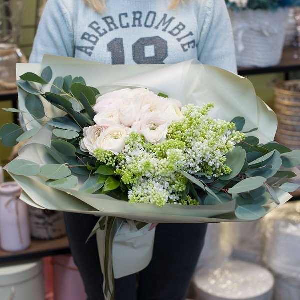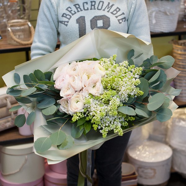 Букет цветов в нежных тонах из ранункулусов сорта Hanoi, белой сирени с эвкалиптом в дизайнерской пленке.