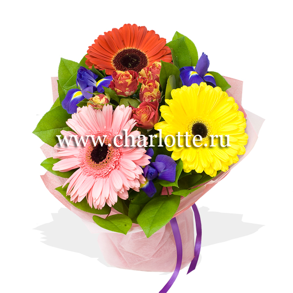 Букет в ярких тонах из гербер, ирисов, кустовых роз с декоративной зеленью в подарочной упаковке. По Вашему желанию цветовую гамму букета можно изменить, для этого звоните в наши салоны цветов или указывайте в разделе "комментарии для флориста" при заказе через интернет.